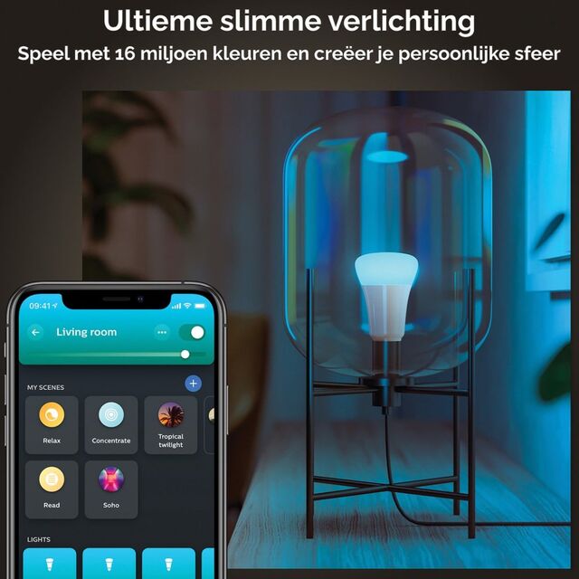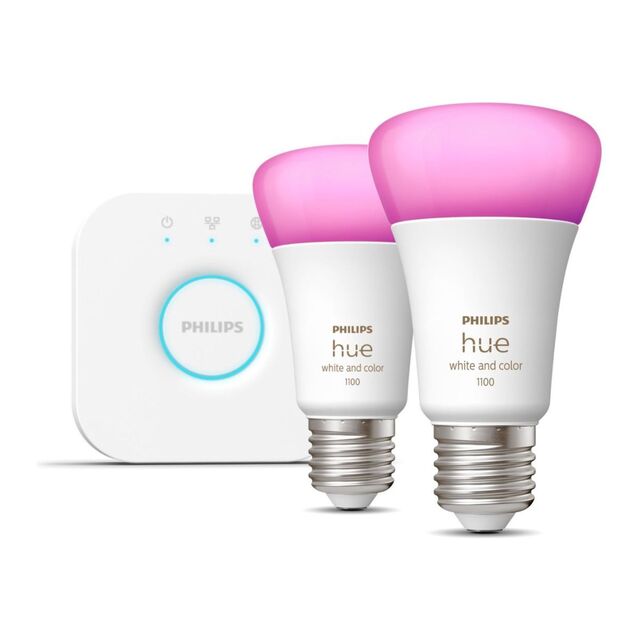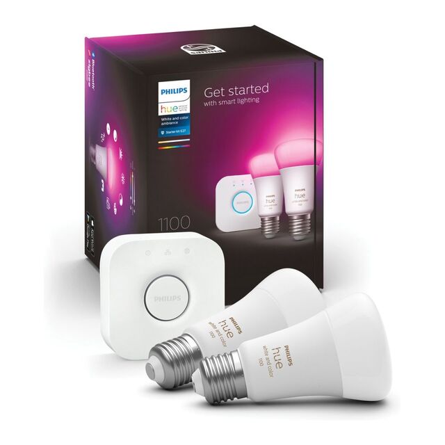 Tover je huis om tot een smart home met deze Philips Hue starterkit, met daarin twee slimme Hue White ambiance and color standaardlampen met E27-fitting. Met deze gekleurde LED-lampen beleef je de magie van slimme verlichting. Stel koelwit licht in als je meer focus nodig hebt om te werken, warmwit licht om te ontspannen of kies een van de 16 miljoen prachtige kleuren. De lampen hebben een sterkte van 1100 lumen, wat vergelijkbaar is met een gewone gloeilamp van 75 W. Krijg je gasten over de vloer of plan je een feestje? Met de Philips Hue app kies je eenvoudig een ander lichtrecept of maak je jouw persoonlijk lichtrecept. De starterkit is natuurlijk compleet met een Hue Bridge, waarmee je toegang krijgt tot alle slimme verlichtingsfuncties zoals timers, automatiseringen en bediening als je niet thuis bent.